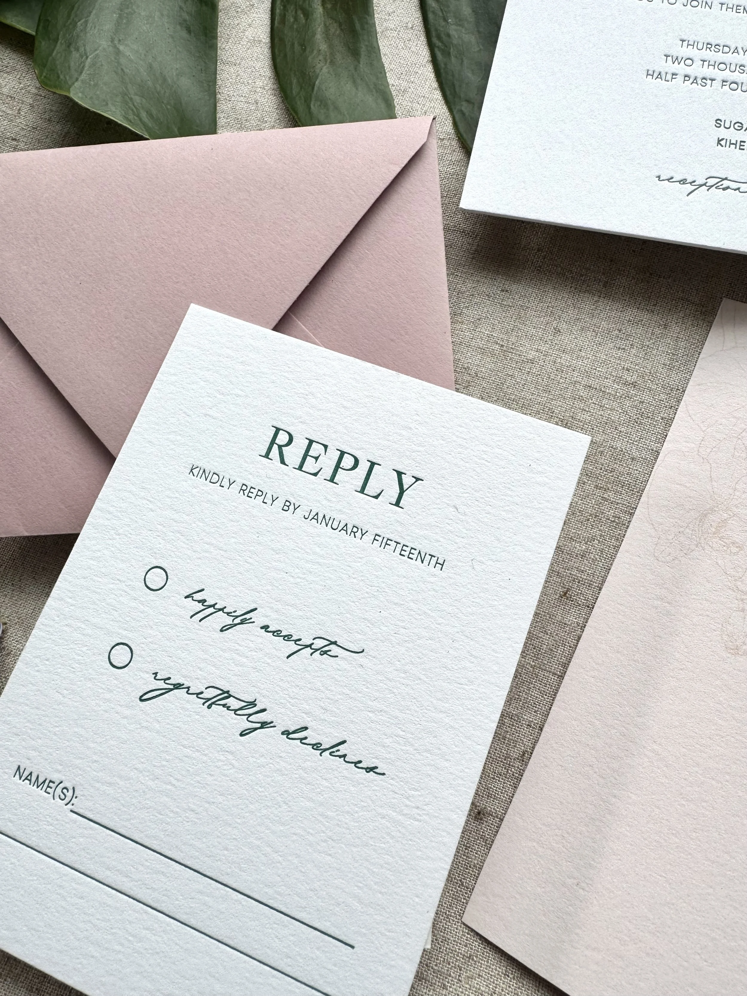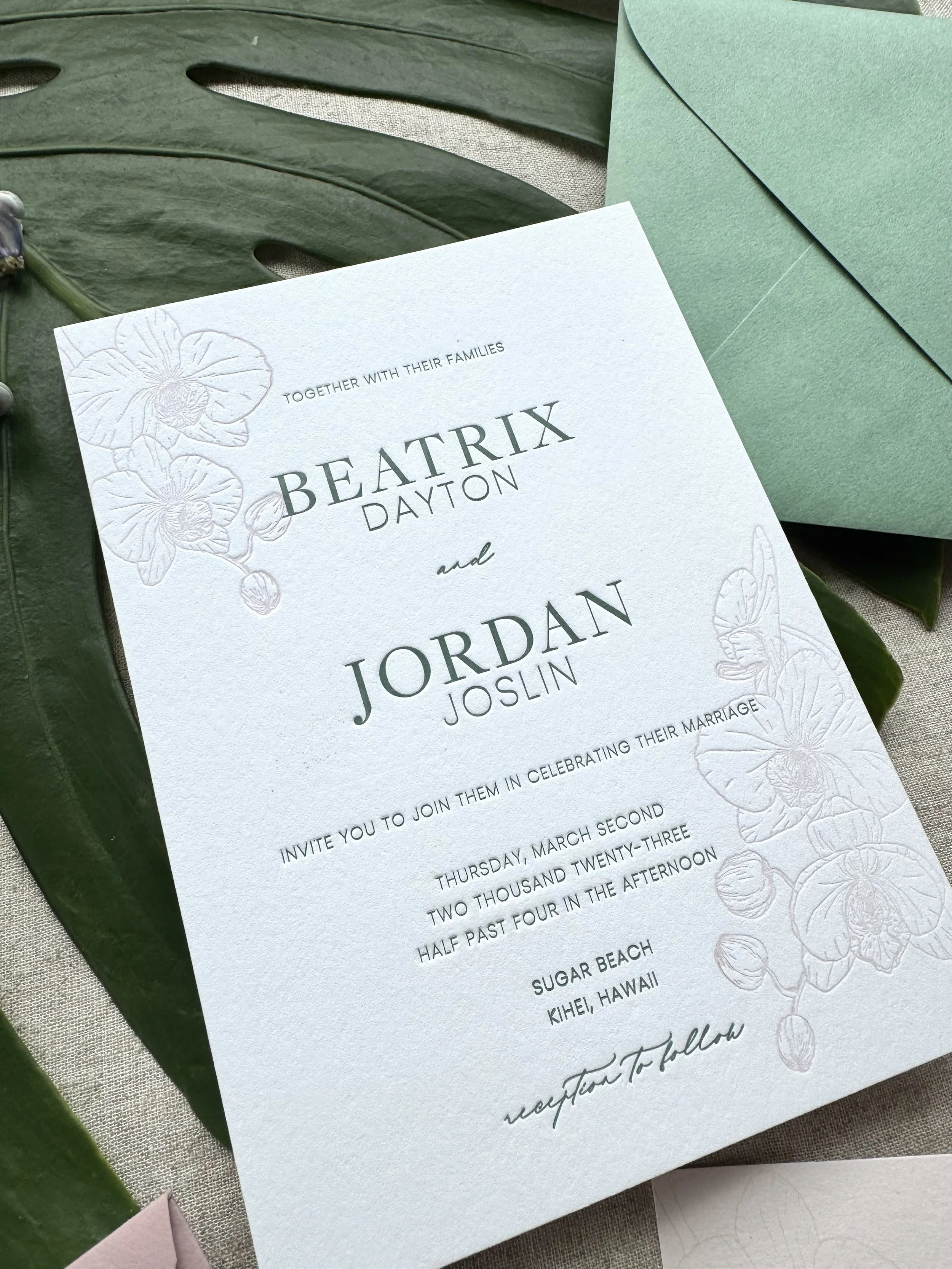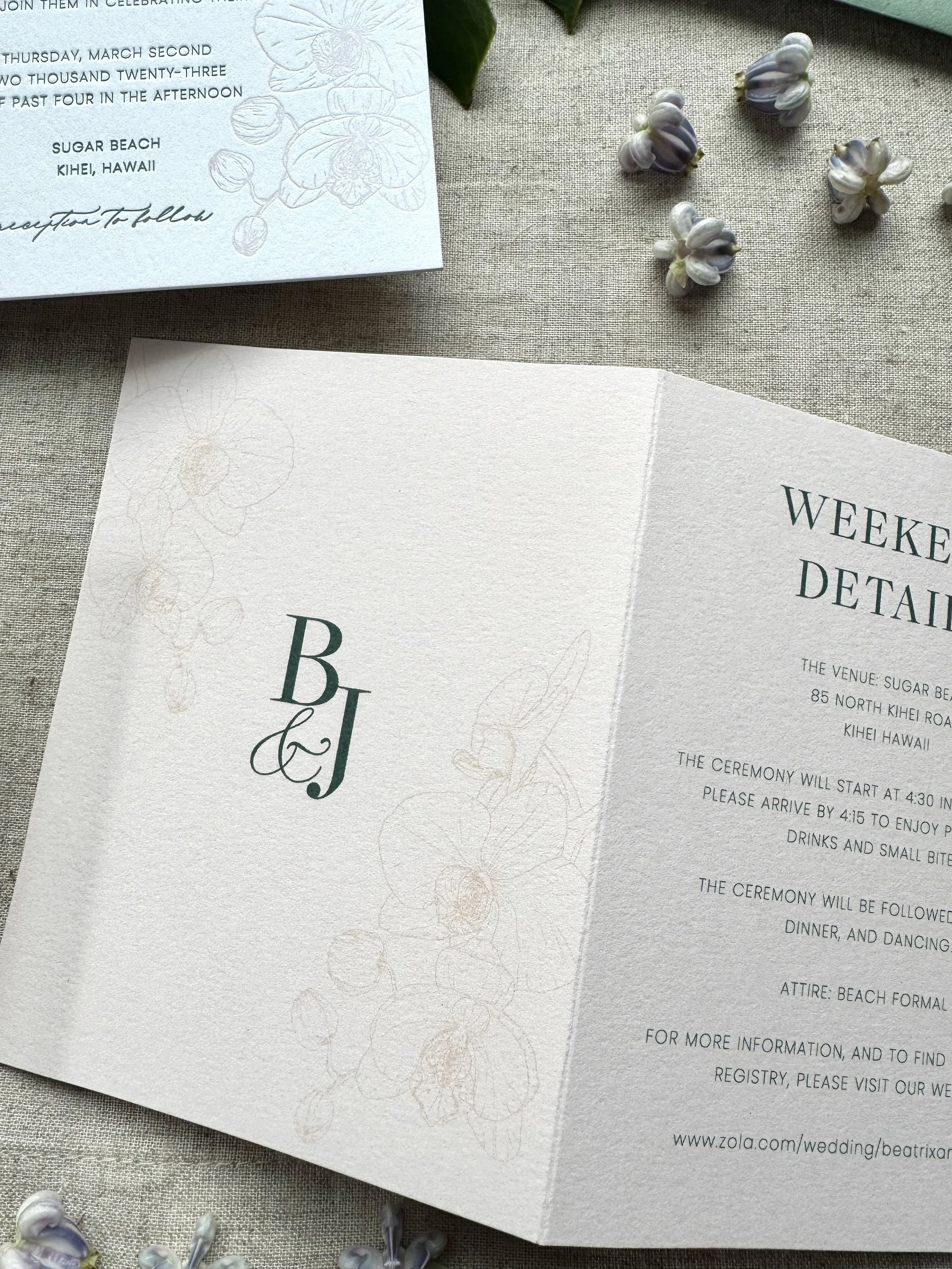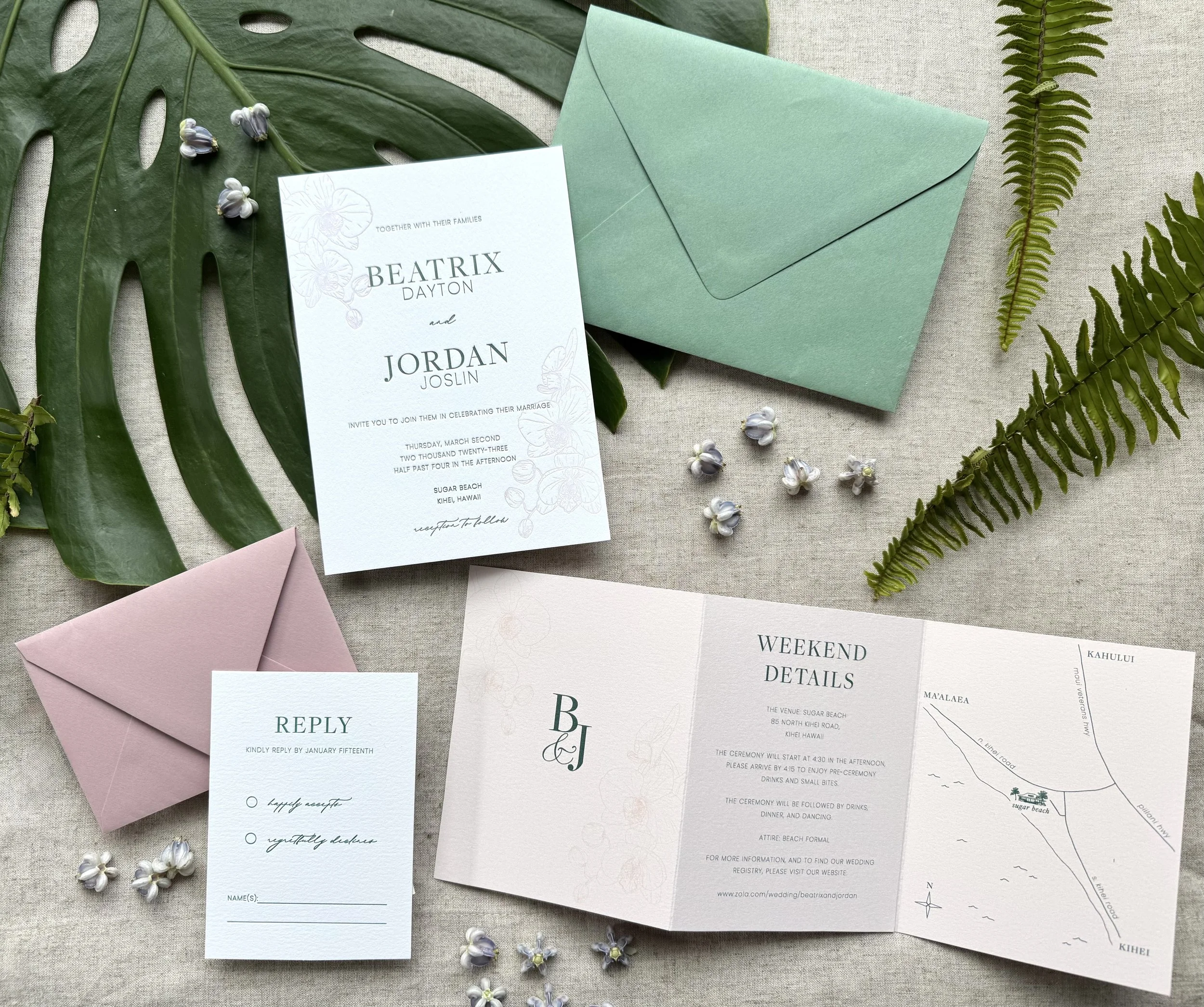 This elegant tropical letterpress wedding invitation suite was designed for a romantic celebration on Sugar Beach. The main invitation features delicate orchid illustrations printed in soft blush ink with deep green typography, creating a refined island-inspired aesthetic.Paired with coordinating sage and blush envelopes, this suite includes a minimalist letterpress RSVP card and a fold-out weekend details card complete with a custom Maui wedding map.