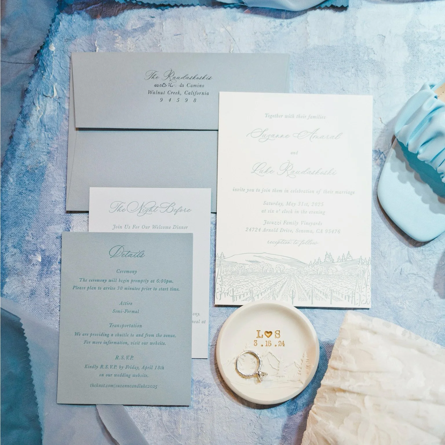 Our Lookbook showcases past projects that we now offer as semi-custom options for your wedding suite. If you don’t want to go the full custom route, semi-custom is a great way to combine elements of existing designs to create something unique to you and your wedding.